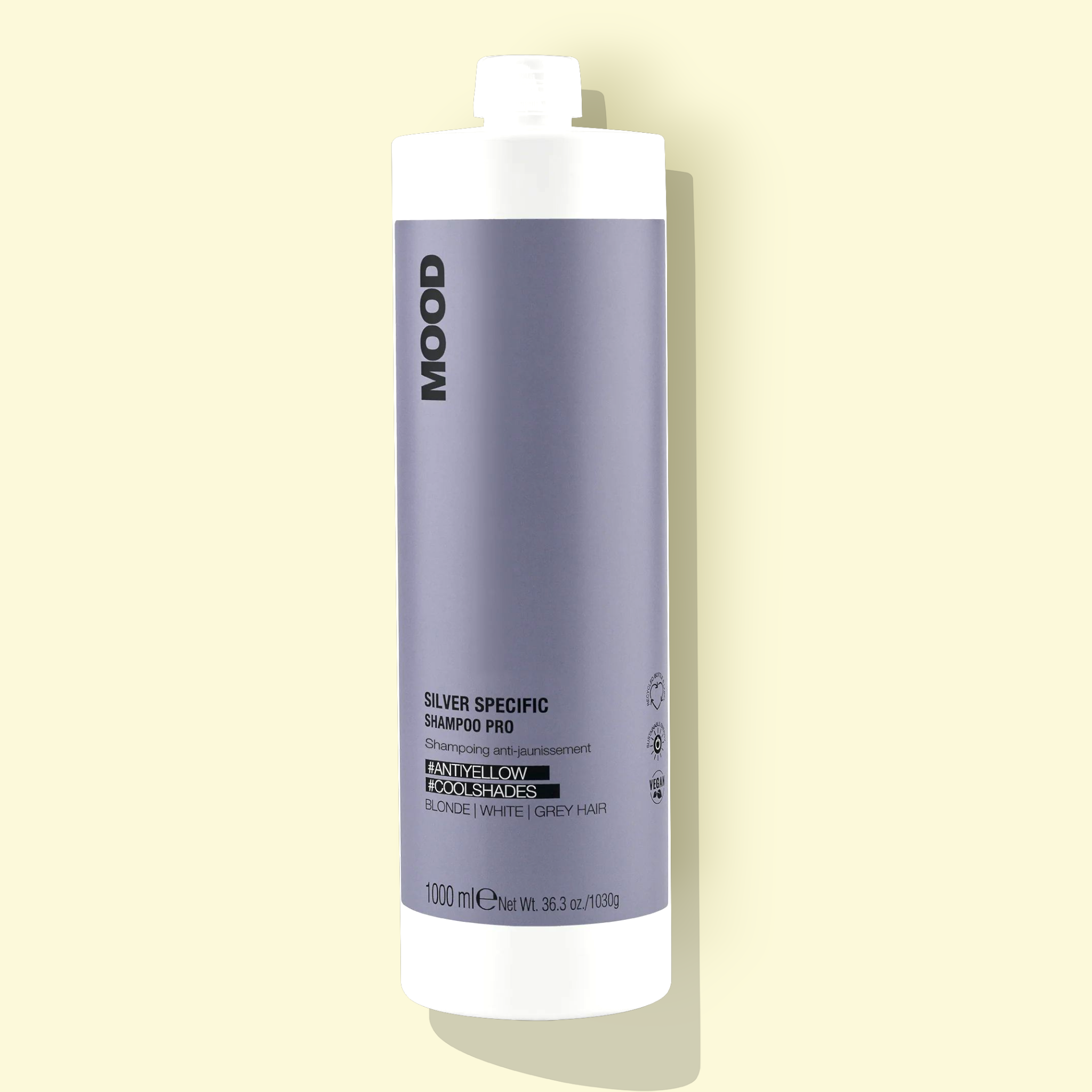 Mood Silver Specific Shampoo 🍇✨ Uno shampoo antigiallo professionale, formulato con pigmenti viola puri ed estratto di mirtillo, che agisce eliminando i riflessi caldi indesiderati, esaltando i toni freddi e luminosi dei capelli bianchi, grigi e biondi. La sua azione tonalizzante è efficace su capelli naturali, colorati, schiariti o decolorati, donando brillantezza e un riflesso argento equilibrato ✨🌈.
