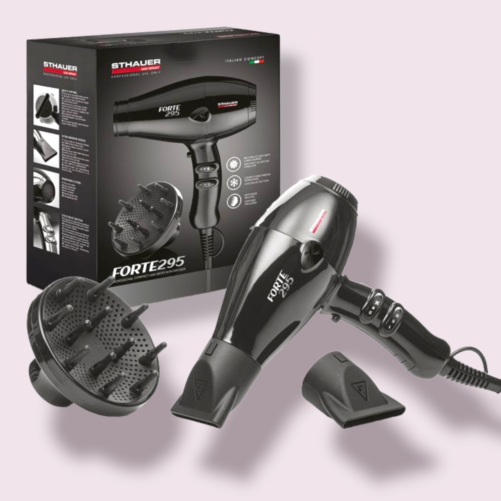 Asciugacapelli ad asciugatura rapida 2000 watt ideale per tutti i tipi di piega. Ad uso intensivo e per questo consigliato per i saloni di parrucchieri. Progettato per un uso professionale intensivo, con un motore AC lunga durata. Colpo d’aria fredda istantanea.