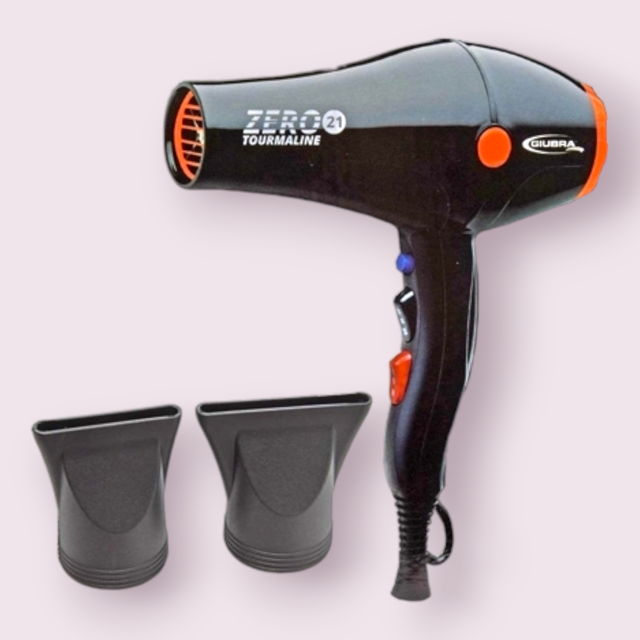 L’asciugacapelli professionale Zero 21 Tourmaline di Giubra è caratterizzato da una forma compatta e un motore di lunga durata da 2000 W di potenza.